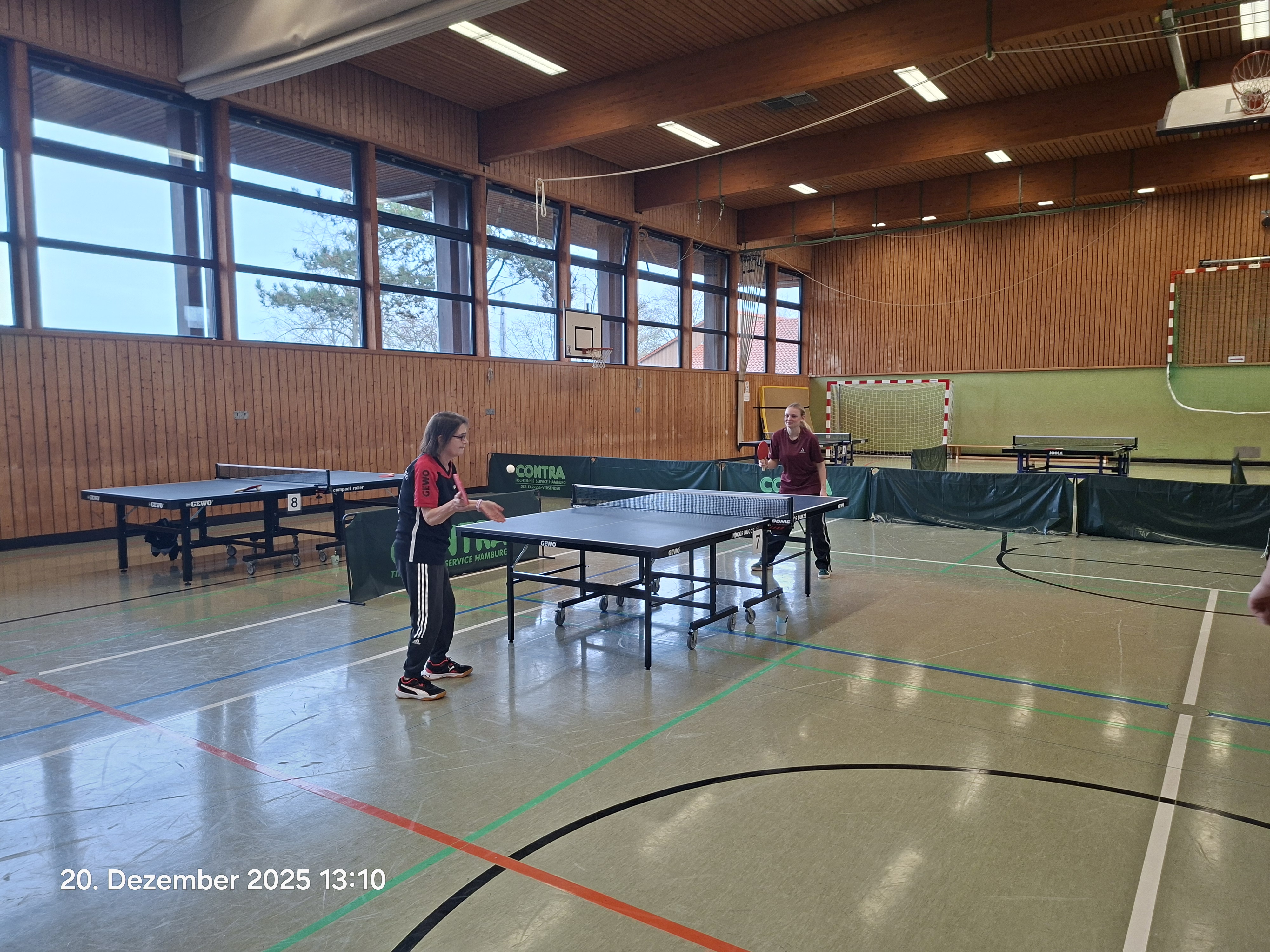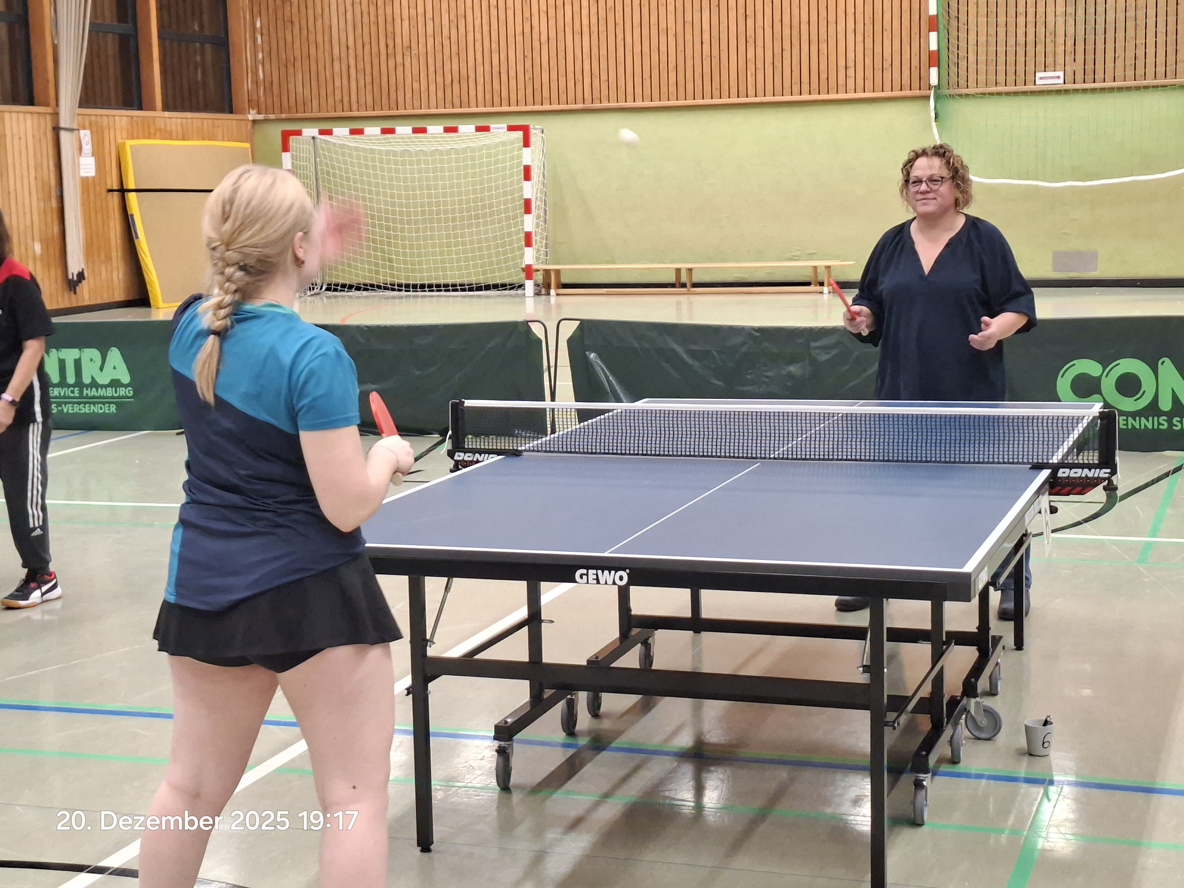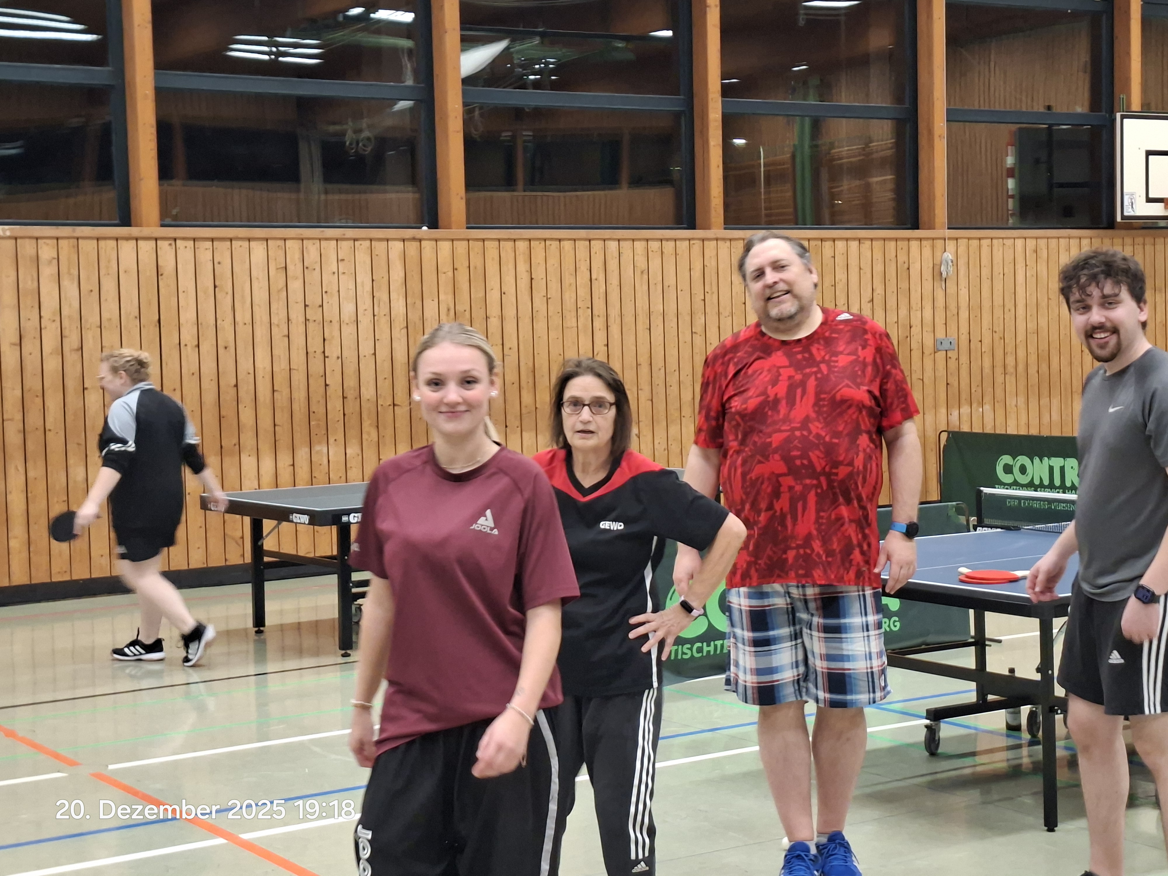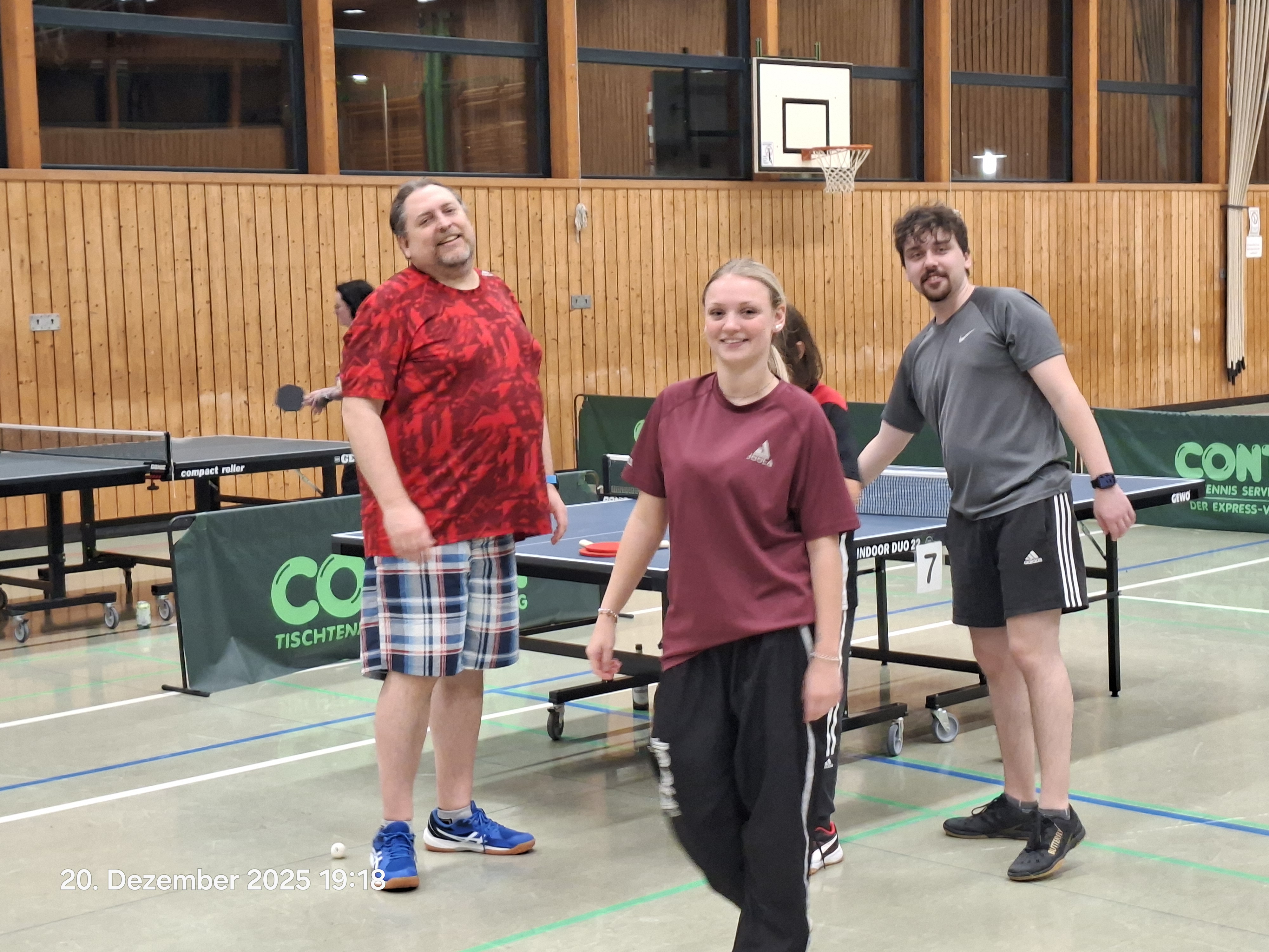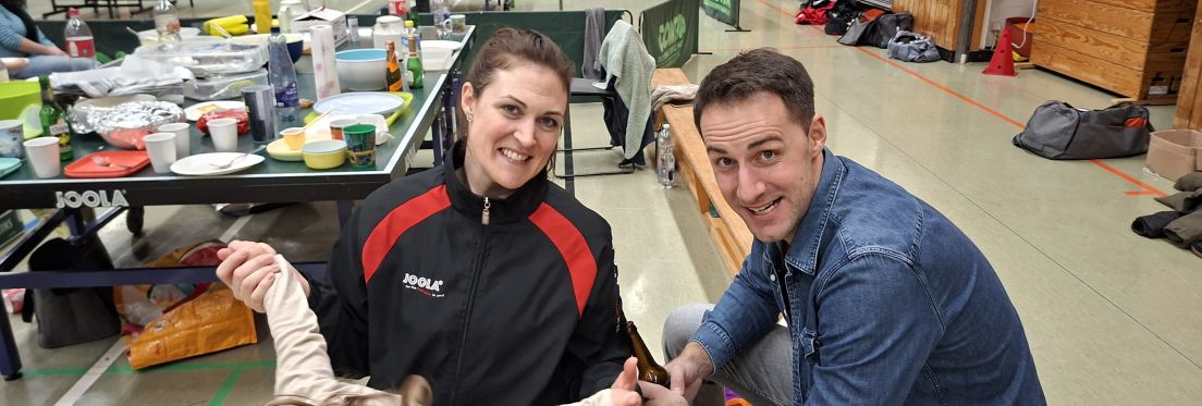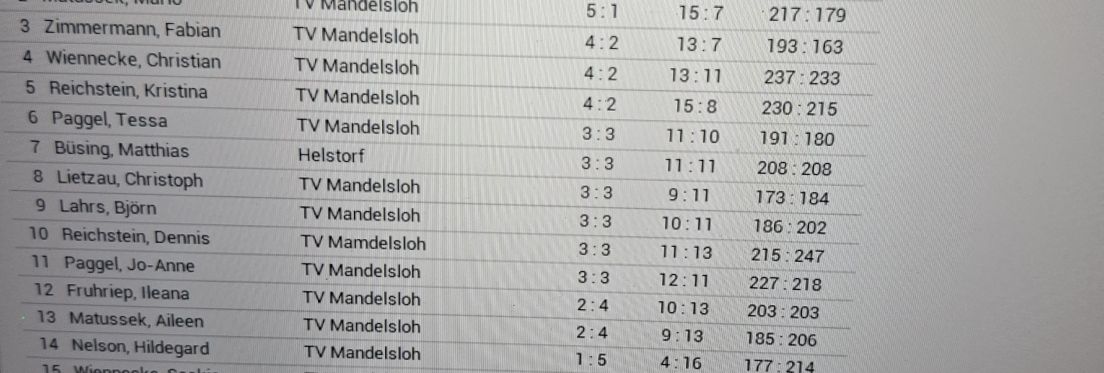 Mit 9 Männern und 9 Frauen hatten wir exakt 9 zufällig gezogene Mixed-Paarungen am Start. Zuvor hieß es jedoch im Einzel erst einmal wieder, sich an die ungewohnten Flugbahnen und die schwer zu zähmenden Brettchen zu gewöhnen.
